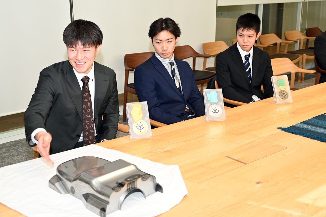 木村学長との懇談では、日産から金賞を獲得した吉田将選手らが技能五輪で競技時間といった概要をはじめ、課題のレプリカを用いて金属板の加工方法や評価のポイントなどを説明。工学部の教員であり、長年にわたってToCoチャレ「東海大学ソーラーカーチーム」の監督を務めるなど金属加工技術にも知見の深い木村学長と金属板を叩いて曲げる作業の難しさや挑戦的な技術について意見を交わしました。また、大会の1カ月半前から毎日7時間の練習に取り組む中で、短時間で金槌を振るためにアスリートのようなトレーニングスケジュールと栄養管理の重要性が語られ、本学教員によるサポートによって、メンタルケアや競技中のプレッシャー管理、カフェインの摂取量の調整などの効果が語られました。