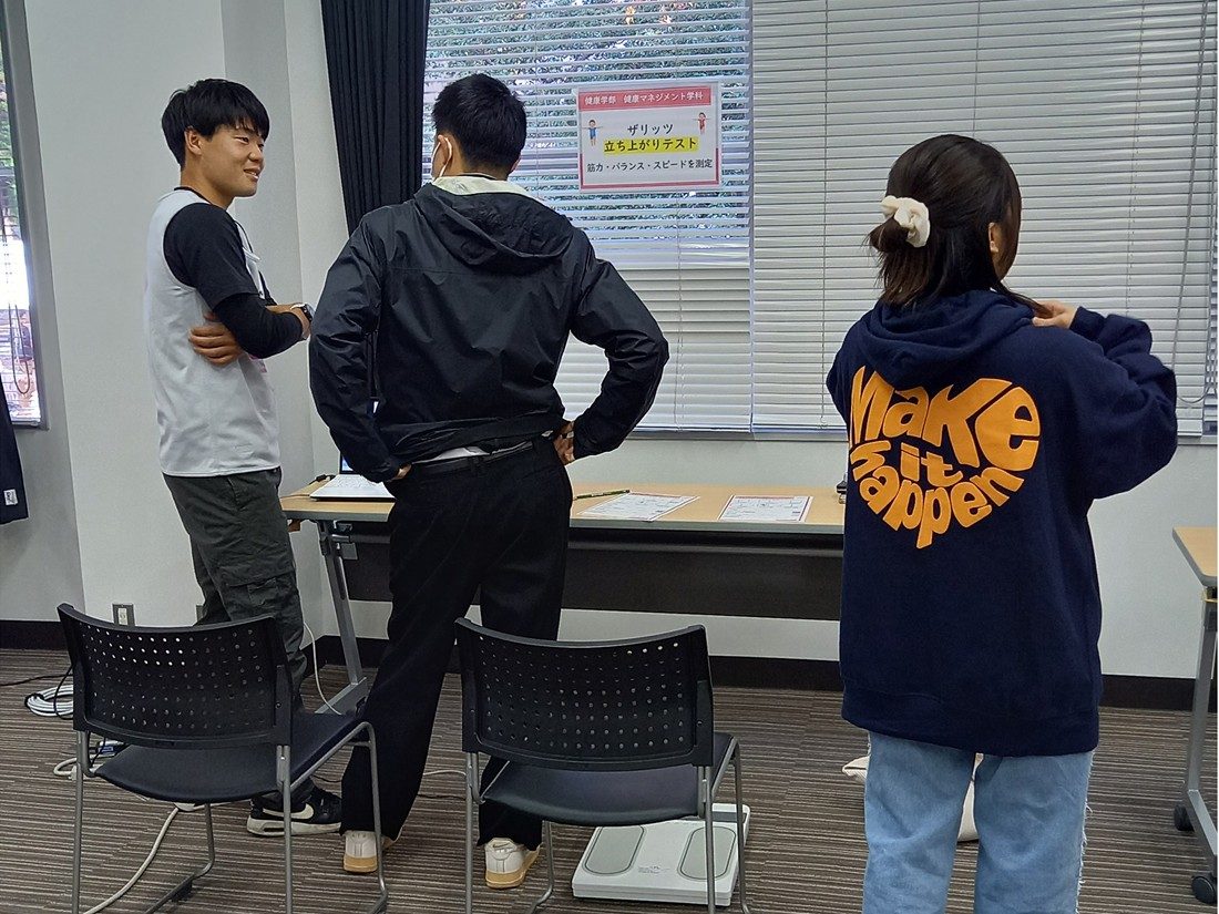 上江洲泰佑さん(3年次生)は、「年齢を問わずたくさんの方が来てくださり、測定の良し悪し関係なく楽しみながら参加してくれていました。 測定会を機に、現状を見直すことによって、これからの健康に対するモチベーションも増加したので、私自身にとっても最高のやりがいに繋がりました」とコメント。和田勇樹さん(同)は、「子どもから高齢者まで幅広い年代の方が来てくださり、測定する中でさまざまな人たちとコミュニケーションを楽しむことができました。年代関係なくペグ移動などの結果を家族や友達同士で比較して楽しんでいる姿が印象的でした」と体験を語りました