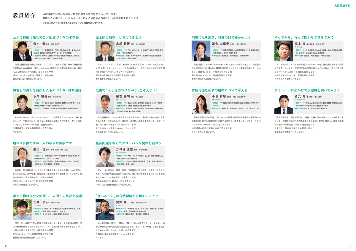 人間を取り巻く環境について学びます。例えば、SDGs(持続可能な開発目標)のような問題に着目し、自然科学、社会科学、人文科学科のさまざまな学術的な見地から人間生活の持続可能性を考えます。人間生活において必要不可欠な自然環境や社会環境について研究し、広い意味での環境問題などの人間環境全般を学ぶことができます。通常の授業に加えて、さまざまな実験・調査や体験実習などを行います。