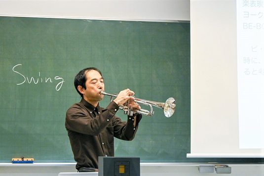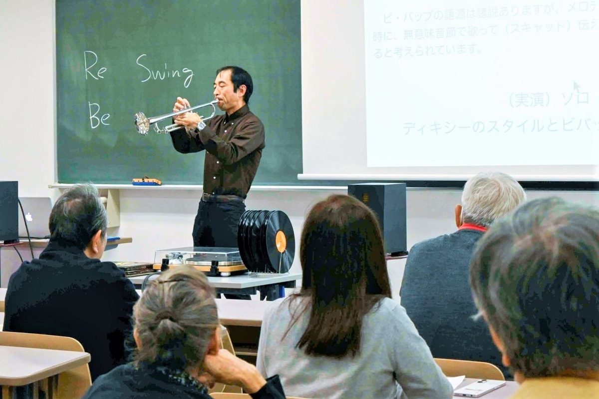 10月1日の第1回は「ジャズとコントラファクト」、15日の第2回は「12小節の定型『ブルース進行』」、29日の第3回は「ジョージ・ガーシュウィンの進行」をテーマに実施。11月12日の第4回「ビ・バップとコントラファクト」では、初めに「抽象表現主義」と呼ばれる前衛的なアートが生まれた1940年代のニューヨークについて解説。ダンスの伴奏や娯楽を主な目的とした大編成のビッグバンドによるSWINGの演奏に対して、制約のあるショーを嫌い、自由な音楽表現を主張したミュージシャンたちの登場によってもたらされたモダンジャズの革命「ビ・バップ革命(THE BE-BOP REVOLUTION)」について、歴史的背景や様式の特徴を説明し、チャーリー・パーカーやセロニアス・モンク、マイルス・デイビスら稀代のプレイヤーの映像・音源を視聴しました。さらに、アドリブソロの特徴をトランペットで実演すると、受講者から大きな拍手が寄せられました。26日の最終回は「ポップミュージックとコントラファクト」をテーマに開講しました。
