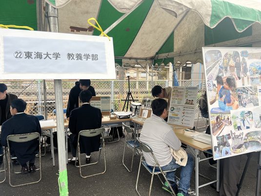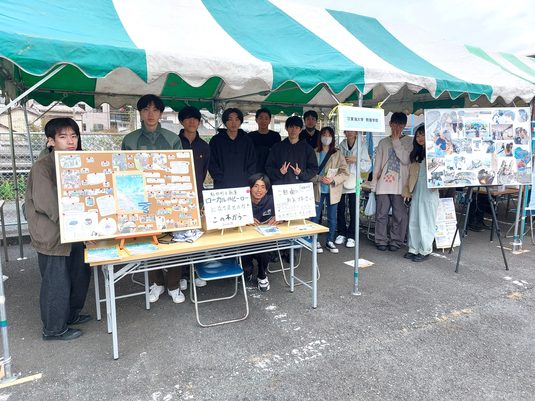 教養学部人間環境学科の岩本泰教授のゼミでは11月10日に、神奈川県松田町のJR松田駅北口広場周辺で開かれた「第25回まつだ産業観光まつり」でブースを出店しました。本学部では2019年から岩本ゼミを中心に同町と連携したまちづくりプロジェクトを展開しており、シティープロモーションの考案や名産品を用いた新商品の開発などに取り組んでいます。今回は、これらの活動を通して地域振興や活性化をテーマとした卒業研究をしている4年次生5名を中心に、3年次生ゼミ生12名も加わって研究に関する展示紹介や商品販売調査などを行いました。