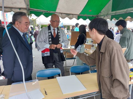 ブースでは、同町の寄地区で生産された米粉を使ったケーキや、樹木の枝が伸びて道路に飛び出してしまい伐採された支障木から取った精油、茶葉を原料としたクレヨンなどを紹介したほか、寄の自然音(サウンドスケープ)を収録して制作した地球環境教育の教材を紹介。本山博幸町長や、同町と姉妹町の協定を結ぶ千葉県横芝光町の佐藤晴彦町長をはじめ多くの住民らが訪れました。岩本教授は、「地域の資源を活用したさまざまなブースが集まる会場で、町の方々と直接触れ合う機会は学生にとっていい経験になったと思います。今回紹介した研究は、今後本学部内で人間環境学科と芸術学科が連携し多彩なプロジェクトに取り組む学科共有科目『プロジェクト研究』(来年度開講予定)の先行事例の1つでもあり、とりわけ試行年の今年度は、サウンドスケープの収録には芸術学科の檜垣智也准教授にもご指導いただきました。来年度以降も学部の特色を生かしたさまざまな手法で、松田町のまちづくりに楽しく携わっていければと考えています」と話しています。