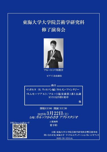 大学院芸術学研究科音響芸術専攻2年次生でフルート奏者の戸川竣介さんが、3月22日(土)に神奈川県・カルッツかわさき アクトスタジオで演奏会を開催します。大学院芸術学研究科音響芸術専攻演奏分野の修士課程修了にあたって開く単独リサイタルで、これまで磨いてきた演奏技術と練習の成果を披露します。入場料は無料です。下記二次元コードよりお申込みのうえ、ぜひご来場ください。