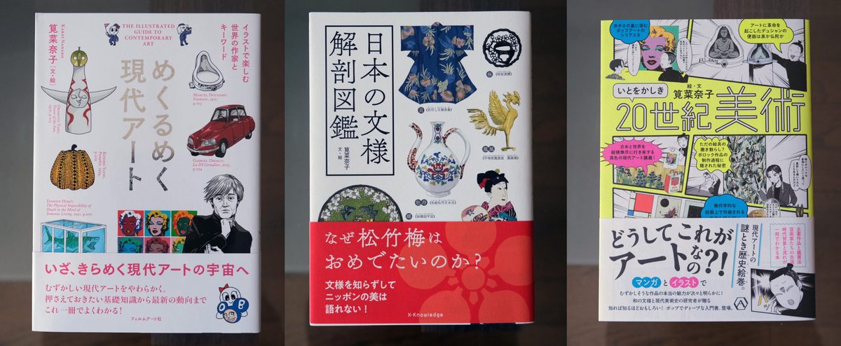 左から、『めくるめく現代アート』(フィルムアート社)、 『日本の文様 解剖図鑑』(エクスナレッジ)、『いとをかしき20世紀美術』(亜紀書房)