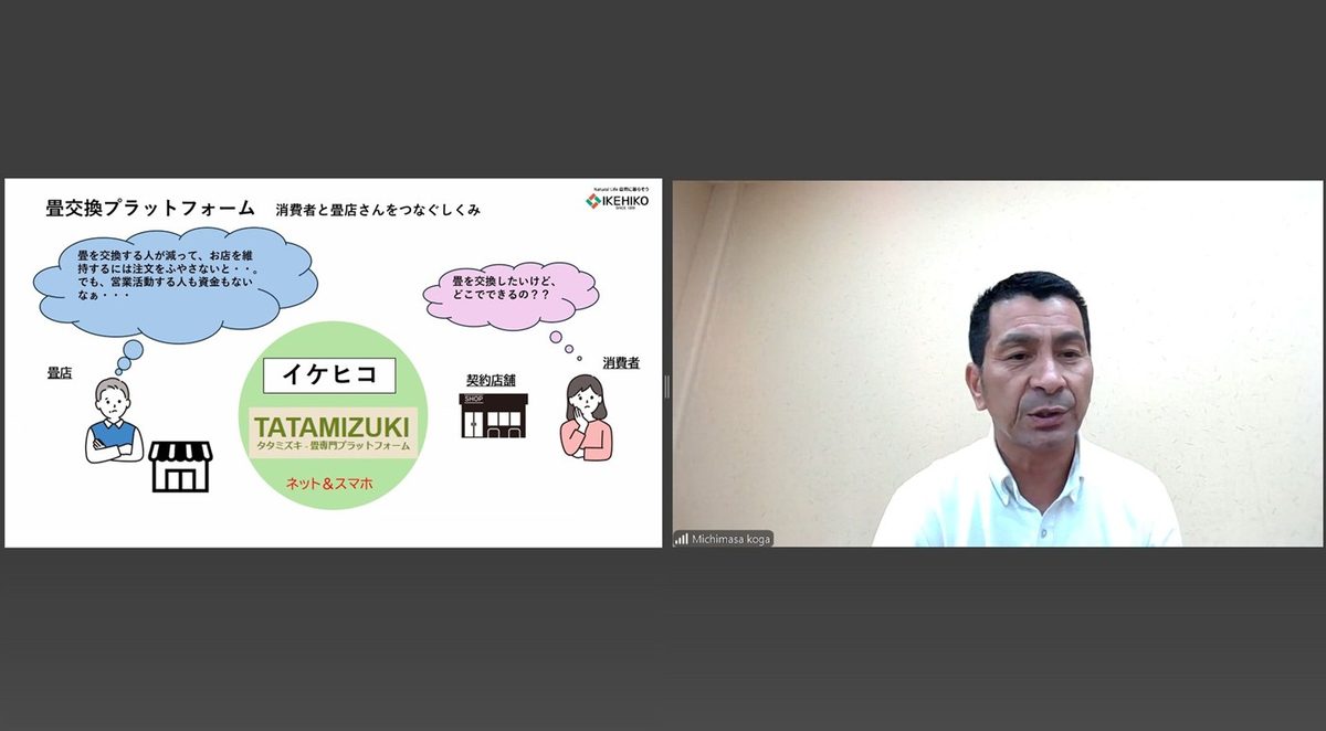 教養学部人間環境学科の開講科目「エシカル消費論」(担当=岩本泰教授)で7月3日と10日に、学外講師による特別講義を実施しました。この授業は、持続可能な社会づくりに向けて具体的な消費行動を構想する能力を養うことを目的としており、今回はい草製品・畳・こたつ・ラグ・寝具製品を中心にインテリア商品の開発・製造・企画・販売を展開する総合インテリアメーカーの株式会社イケヒコ・コーポレーションの古賀義政氏がオンラインで講師を務めました。