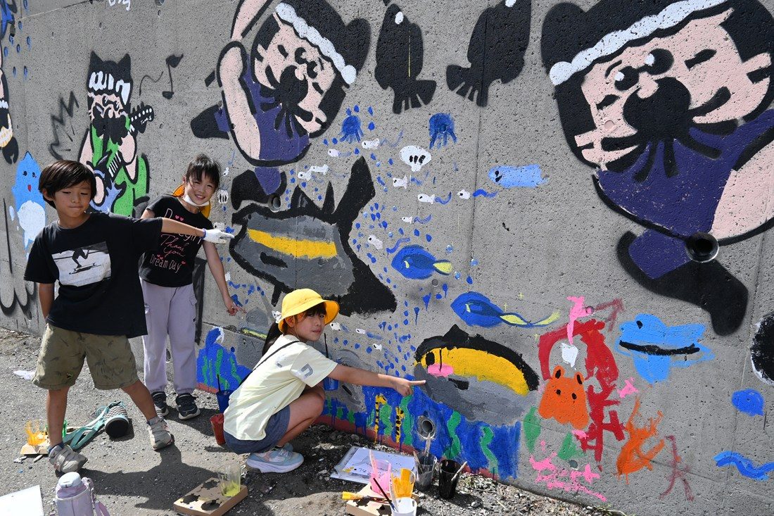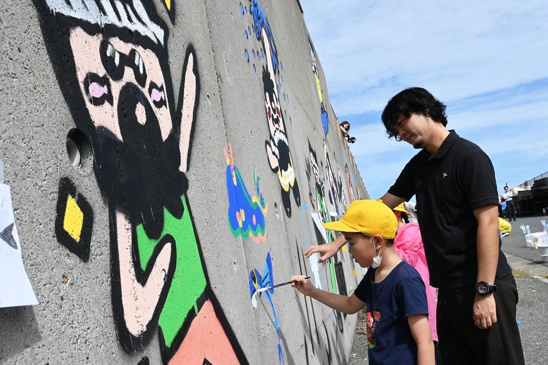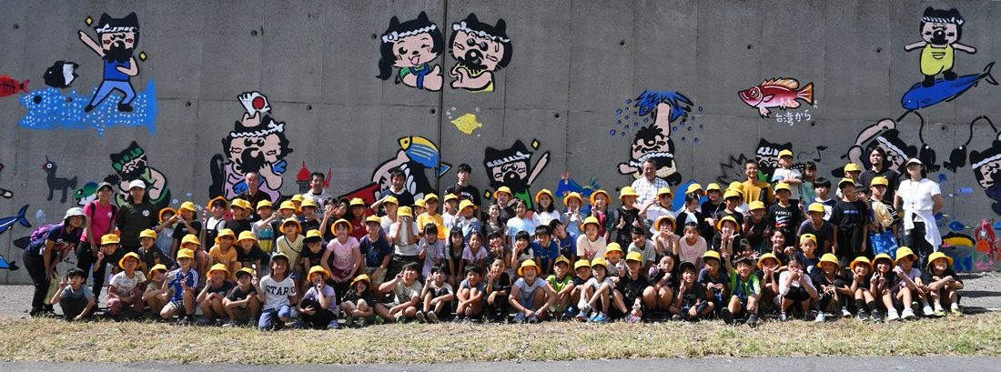 教養学部芸術学科では10月2日に平塚市の「ひらつかタマ三郎漁港」で、平塚市立港小学校の小学3年生と壁画を制作しました。この取り組みは、漁港入口の擁壁に壁画を施すことで漁港のPRや落書き防止につなげることを目的に、平塚市と東海大学の交流提携40周年記念事業の一環として企画されたものです。本学科の開講科目「ラボラトリートライアル(地域連携型アート&デザインプロジェクト)」(指導教員=池村明生教授、熊谷慶助教)の履修学生たちが今年1月と7月に、本学科卒業生がデザインした市の漁業PRキャラクター「ひらつかタマ三郎」をモチーフとしたスプレーアートを50点描画。そして今回102名の児童がタマ三郎の周りに海の生き物を描き、壁画を完成させました。