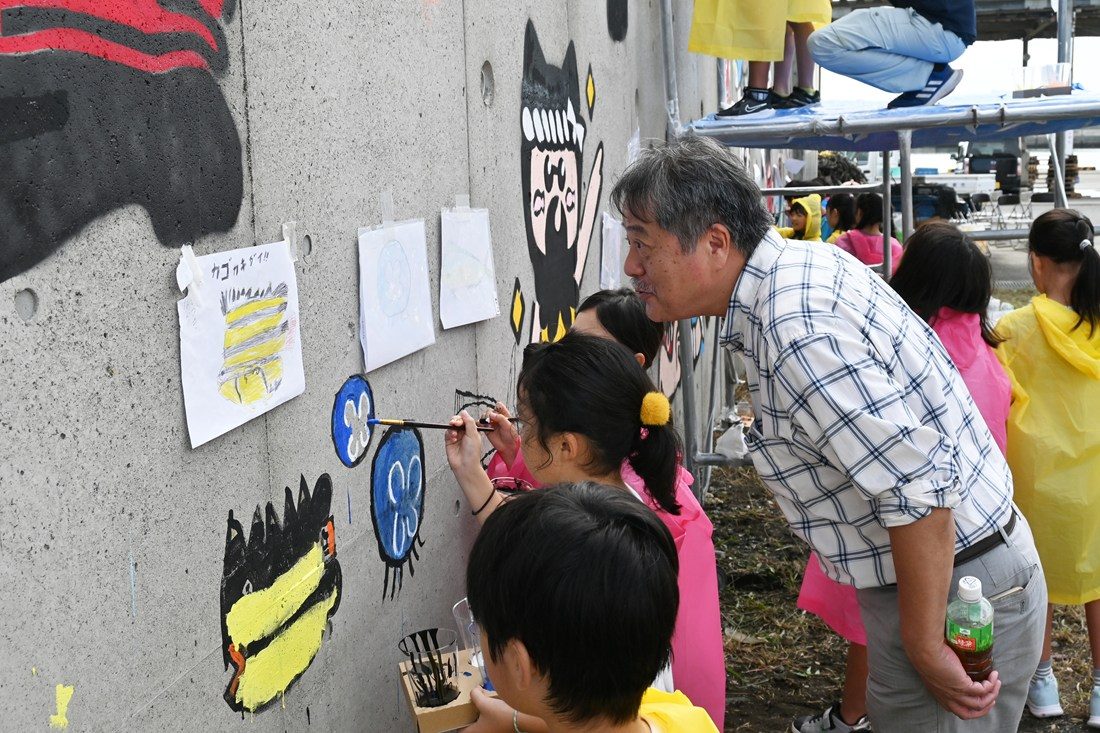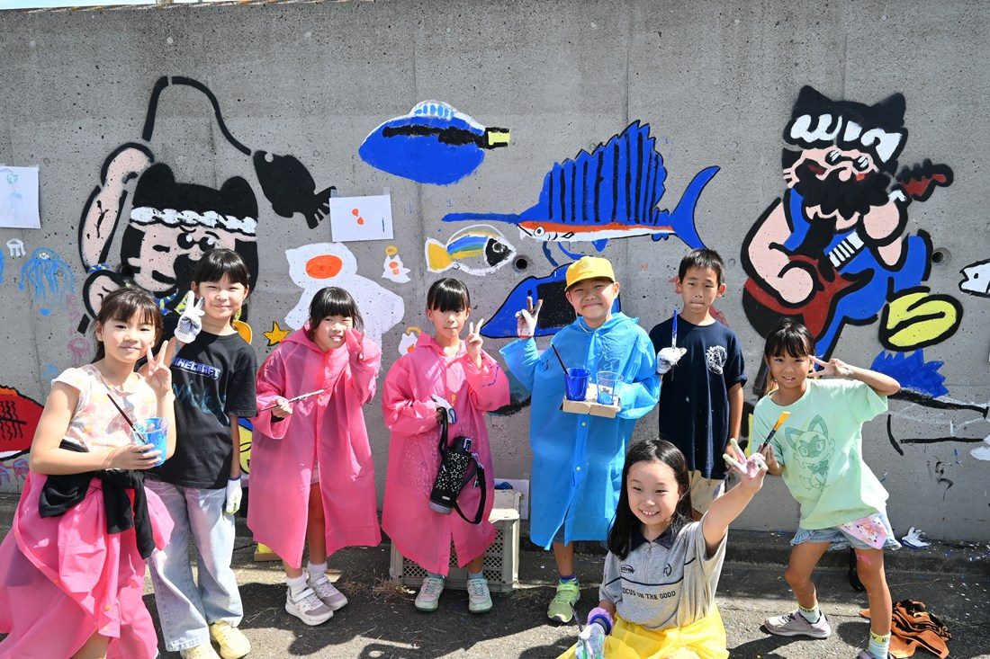 当日は池村教授と熊谷助教、市役所職員や漁業協同組合関係者らが子どもたちを出迎え、子どもたちは同漁港で水揚げされるアジやシイラといった特産品をはじめとした多種多様な海の生き物を描きました。子どもたちからは、「こんなに大きい壁に絵を描くのは初めて。いつも遊んでいる海岸に自分たちの作品が残ることがうれしい」「みんなで頑張って描いたので、壁に落書きをする人が減ると思う」といった声が聞かれました。池村教授は、「漁協から依頼を受けてタマ三郎が誕生してから10年以上経ちますが、小学生にも認知されるキャラクターに育ててもらい、こうして壁画にまでなったことはとても感慨深い。楽しそうに絵を描く姿からエネルギーをもらいました」とコメント。熊谷助教は、「100人規模の大プロジェクトになったのは、市の方々の尽力と池村先生の手腕だと感じています。子どもたちの絵は同じような構図にならず一人ひとり個性豊かで、とても華やかな壁画になりました。地元民や釣りに来た人が壁画の写真をSNSに上げている様子も見られ、話題になっていることをうれしく思います」と話していました。