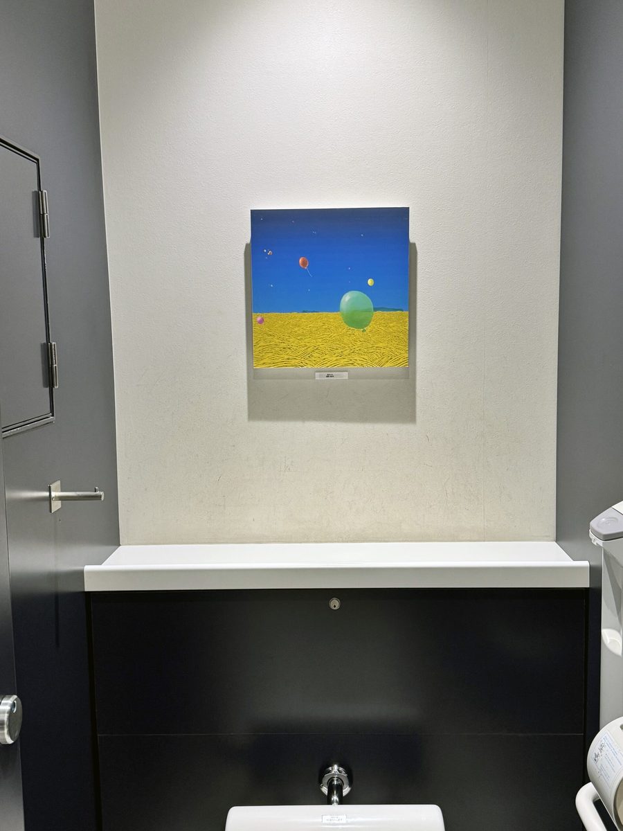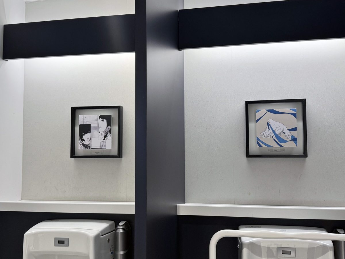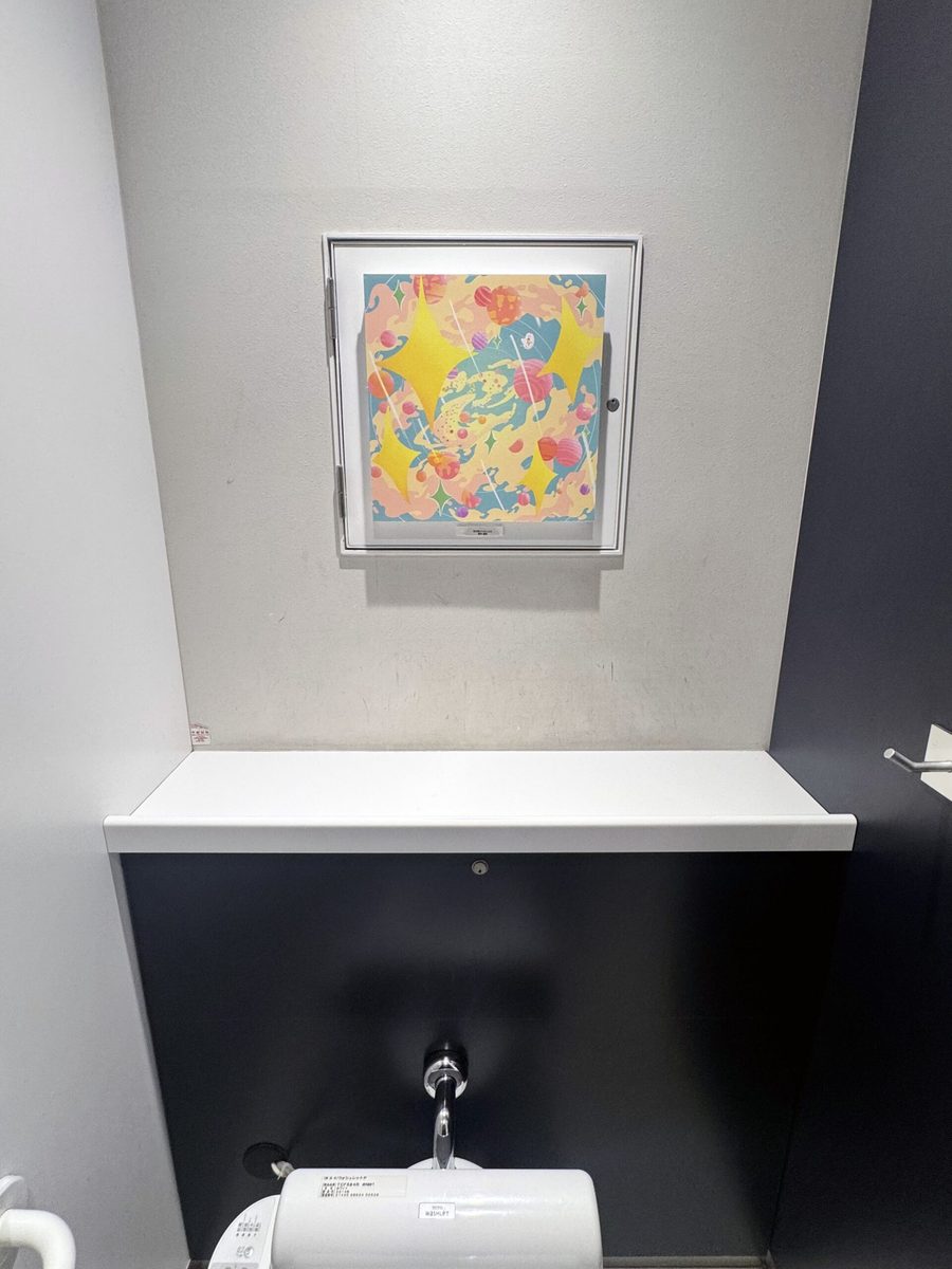 会場は、1階の階段踊り場からトイレ内部にかけて広がる「LUSCA & TOKAI ART GALLERY」。9名の学生が、それぞれの感性を生かした作品を発表しています。