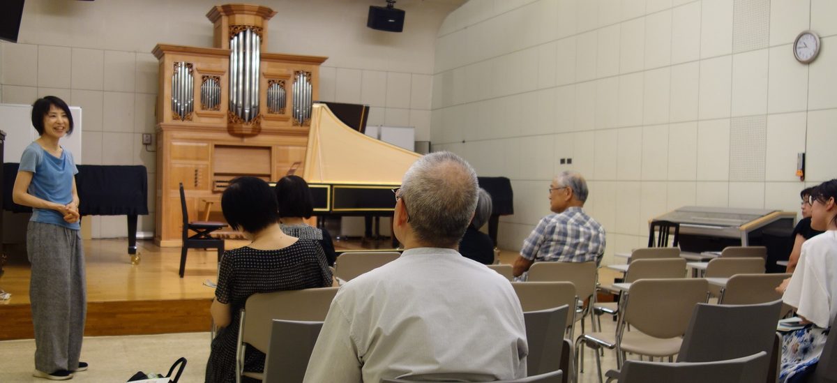 当日ははじめに上薗先生と松本先生のご挨拶がありました。続いて上薗先生の門下生6名がゴールドベルク変奏曲より「アリア」(J.S.バッハ)、ラ・ヴォルタ(W.バード)、パヴァン(O.ギボンズ)、ネヴィル夫人のグラウンド(W.バード)、エアと5つのヴァリエーション(G.F.ヘンデル)、プレリューディウム(J.ブル)、カプリッチョ(G.ベーム)などの演目を披露くださいました。お仕事の傍ら長年練習に励んでおられる方、チェンバロを始めて間もない方などお立場は様々ですが、皆さんチェンバロへの愛情がたいへん深い方々ばかりでした。