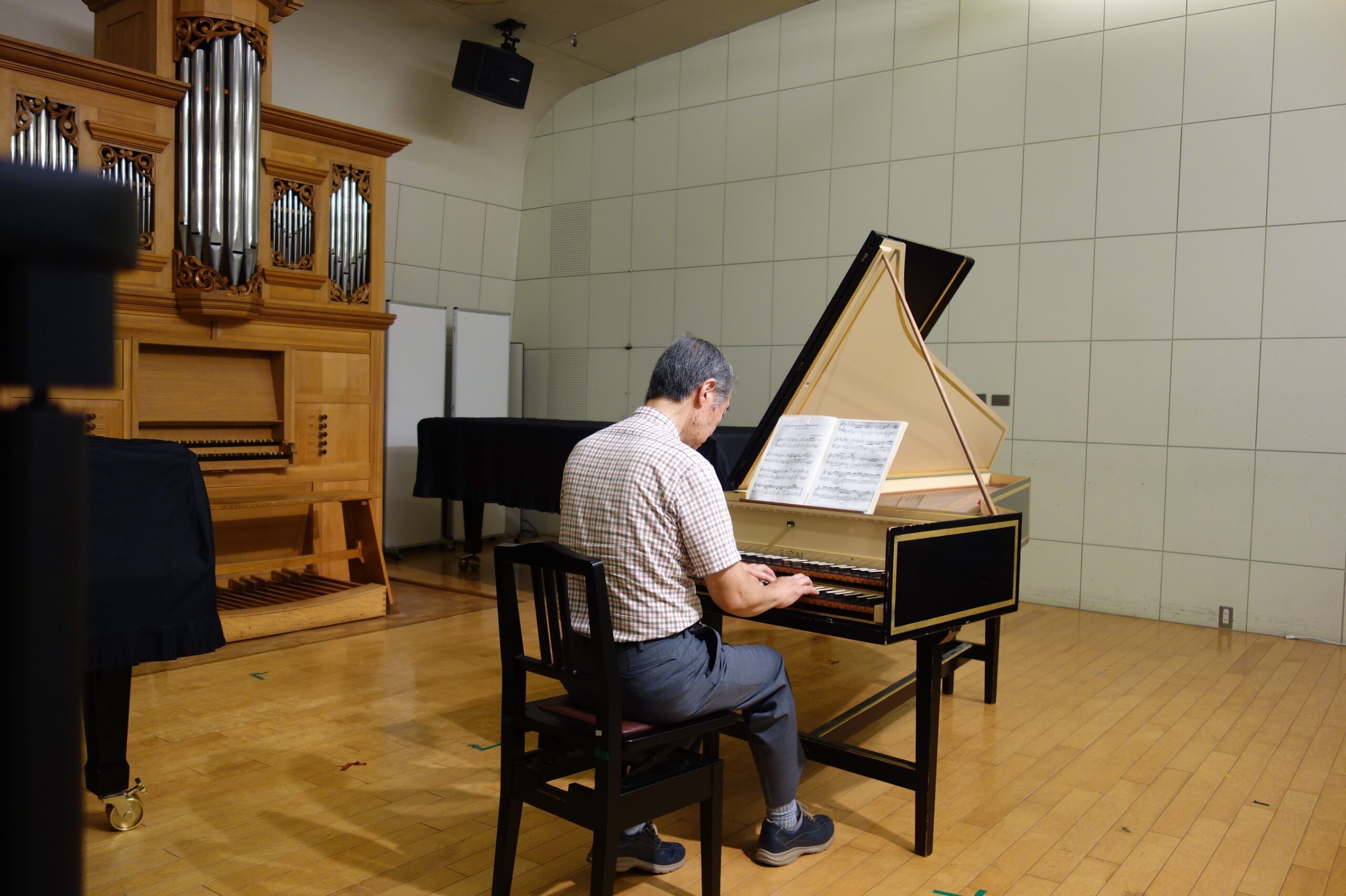 当日ははじめに上薗先生と松本先生のご挨拶がありました。続いて上薗先生の門下生6名がゴールドベルク変奏曲より「アリア」(J.S.バッハ)、ラ・ヴォルタ(W.バード)、パヴァン(O.ギボンズ)、ネヴィル夫人のグラウンド(W.バード)、エアと5つのヴァリエーション(G.F.ヘンデル)、プレリューディウム(J.ブル)、カプリッチョ(G.ベーム)などの演目を披露くださいました。お仕事の傍ら長年練習に励んでおられる方、チェンバロを始めて間もない方などお立場は様々ですが、皆さんチェンバロへの愛情がたいへん深い方々ばかりでした。