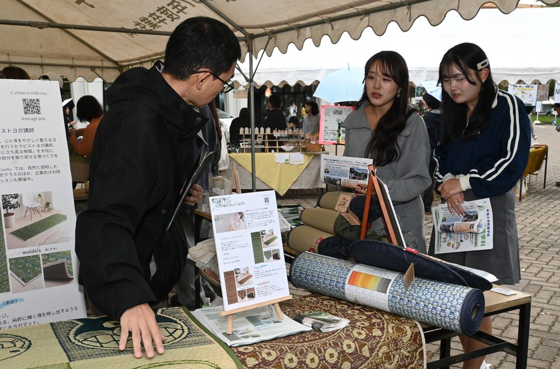 い草製品を販売する総合インテリアメーカーのイケヒコ・コーポレーションは、い草のチップを詰めて高さを調整できる枕作りのワークショップを実施。開場直後に多くの来場者が集まり、同社の社員や学生がい草の機能などを説明しながら製作しました。また、8月に発生した九州豪雨災害の影響で、国産い草の主要産地である熊本県八代市が被害を受けたことから、芸術学科の檜垣智也准教授の研究室と連携してい草の魅力を伝えるオリジナル曲の制作に取り組んでおり、芸術学科の学生がイベントに合わせて同社広報の阿部ひかりさんにインタビューしました。阿部さんは、「神奈川県で学ぶ学生の皆さんが、九州で活動する我々のために動いてくれることはとてもうれしい。私たちが普段行う広報活動では届かない層にも、い草の魅力が伝わる機会になると思います」と語りました。西染工は、タオルを乾燥する際に排出される埃を用いた着火剤や、通常の工程よりも熱量・水量を削減して制作したデニム生地の商品などを販売。学生がTシャルのモデルになり、商品のプロモーションを行いました。