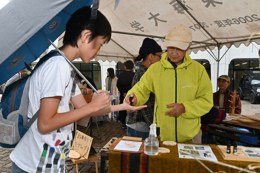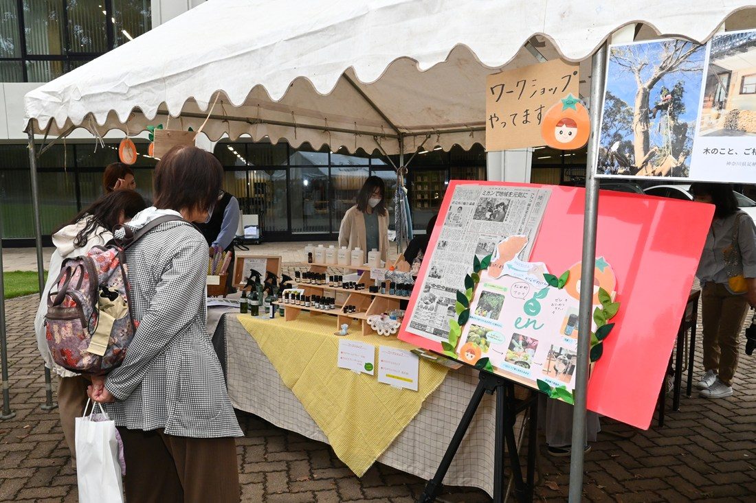また、コミュニティカフェおうちがショップで取り扱う商品を展開。「松田町アロマen」が松田町の農家で普段廃棄されている摘果ミカンを用いて製作した「青みかん精油」の販売と、同商品を用いたナチュラルアロマディフューザーのワークショップを行いました。来場者は精油を染み込ませたウッドチップやハーブ、松ぼっくりなどをカップに詰め、オリジナルの作品を作っていました。NPO法人仂は、間伐材を活用したまな板作りのワークショップや、同町・中津川の水で蒸留したヒノキの精油の香り体験を行いました。松田町アロマenのスタッフは、「学生の皆さんのサスティナブルに関する意識の高さに驚きました。こうした活動を通じて、多くの人に農家の課題や松田町の特産品について知ってもらえたらうれしい」と話していました。岩本教授は、「地場産業を通じて、地域を応援することを目的に本企画を実施しました。間伐材や摘果ミカン、い草やコットンなど、“自然を生かして暮らしを楽しむ”というコンセプトのもと出展していただき、訪れた市民の方々にも楽しんでいただけたと感じています。松田町との連携授業では、長く同町の関係人口を増やす取り組みを実施してきましたが、グローカルフェスタの出展もその一つ。今後も楽しいことや面白いことでつながるきっかけづくりをしていきたい」と語りました。