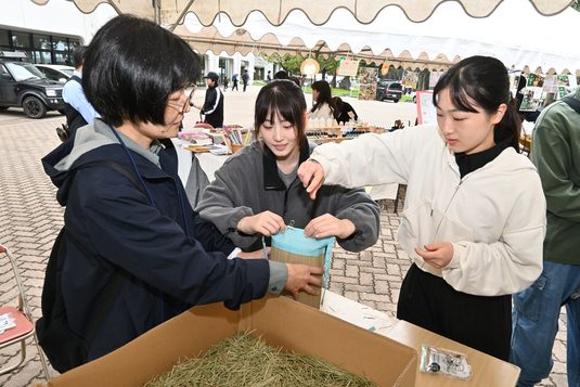 教養学部人間環境学科の岩本泰教授の研究室では、10月11日に湘南キャンパスで開催された「TOKAIグローカルフェスタ2025」の企画として「サスティナブル百貨店」を実施しました。同研究室では2022年度からグローカルフェスタに参加しており、今回はサスティナブルな商品の販売やワークショップを用意。岩本教授が担当する同学科開講科目「エシカル消費論」などで外部講師を務める株式会社イケヒコ・コーポレーションと、今治タオル製品メーカーの西染工株式会社、同研究室がシティープロモーションに協力している神奈川県松田町で活動するコミュニティカフェおうち、NPO法人仂が出店しました。