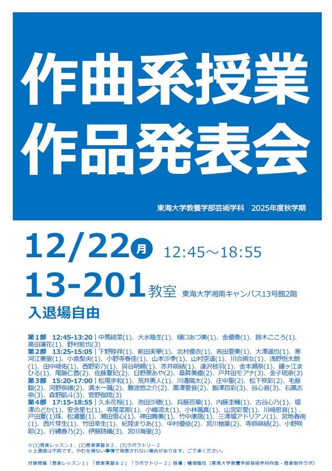 授業科目「音楽レッスン2」「音楽実習B2」「ラボラトリー2(作曲・音楽制作ラボ)」の受講生による作曲系授業作品発表会を以下のように開催いたします。