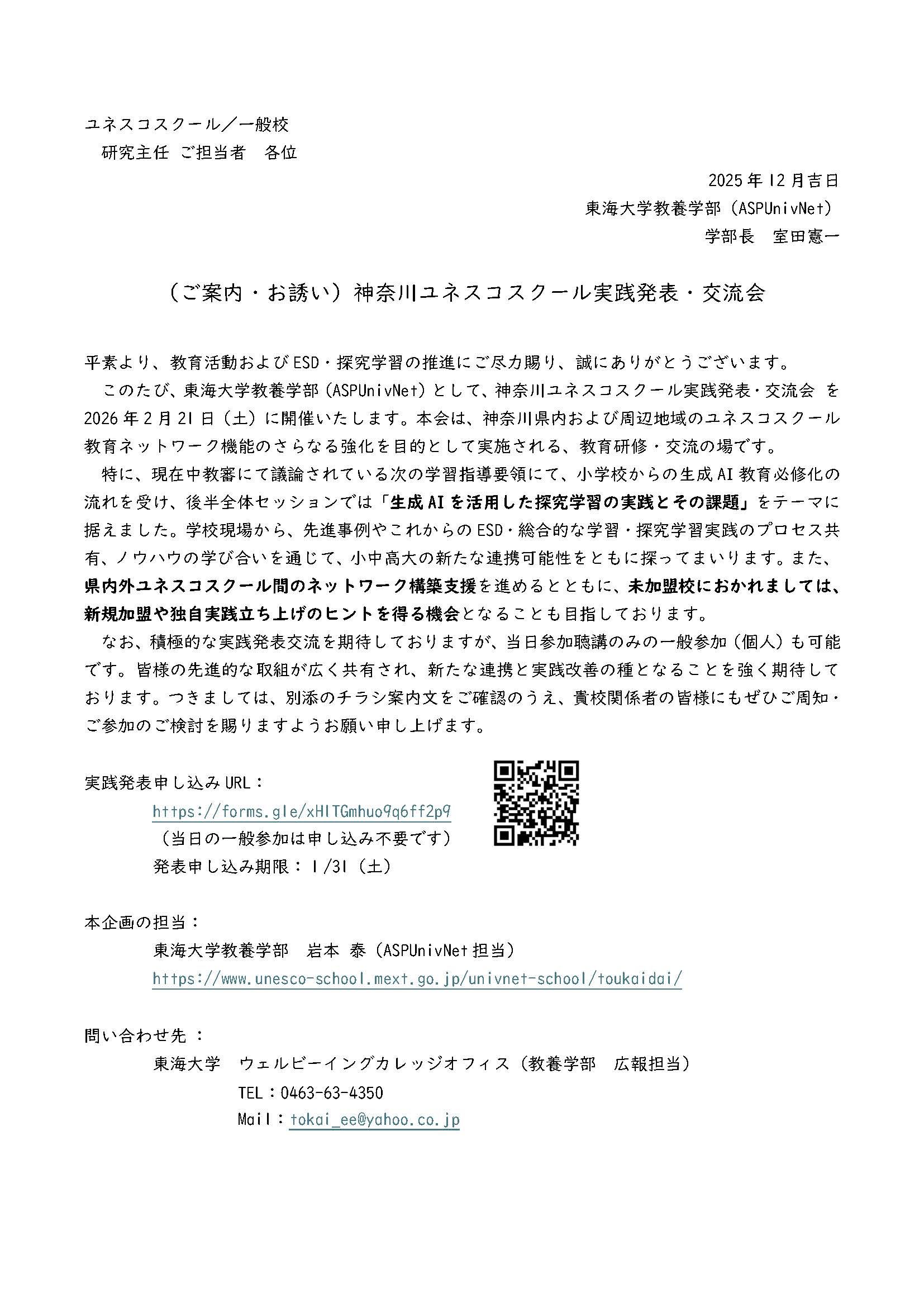 本企画では、積極的な実践発表交流を期待しておりますが、当日参加聴講のみの一般参加(個人)も可能です。皆様の先進的な取組が広く共有され、新たな連携と実践改善の種となることを強く期待しております。つきましては、別添のチラシ案内文をご確認のうえ、貴校関係者の皆様にもぜひご周知・ご参加のご検討を賜りますようお願い申し上げます。