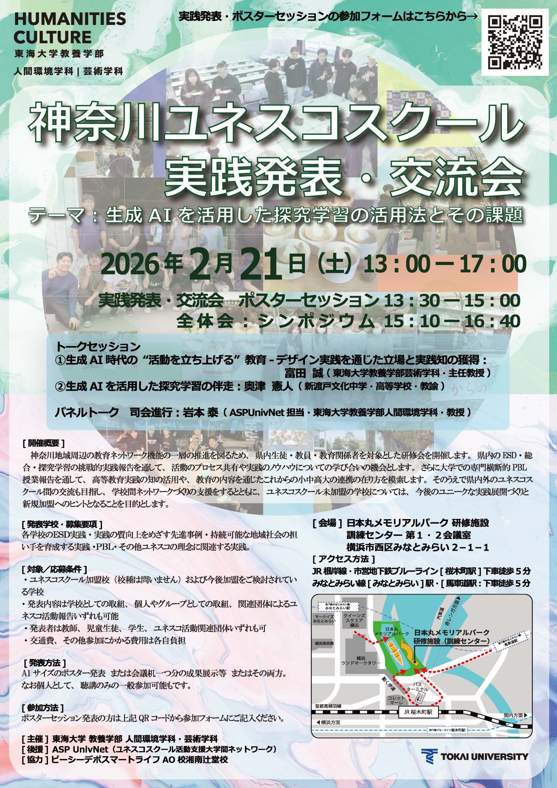 東海大学教養学部 (ASPUnivNet参加大学)では、神奈川ユネスコスクール実践発表・交流会 を2026年2月21日(土)に開催いたします。本会は、神奈川県内および周辺地域のユネスコスクール教育ネットワーク機能のさらなる強化を目的として実施される、教育研修・交流の場です。 本企画では、神奈川地域周辺の教育ネットワーク機能の一層の推進を図るため、県内生徒・教員・教育関係者を対象とした研修会を開催します。地域のESD・総合・探究学習の挑戦的・革新的実践報告を通して、活動のプロセス共有や実践のノウハウについての学び合いの機会とします。さらに、大学での専門横断的PBL授業報告を通して、高等教育実践の知の活用や、教育の内容を通じたこれからの小中高大の連携の在り方を模索します。そのうえで、県内外のユネスコスクール間の交流も目指し、学校間ネットワークづくりの支援の場づくりをめざします。