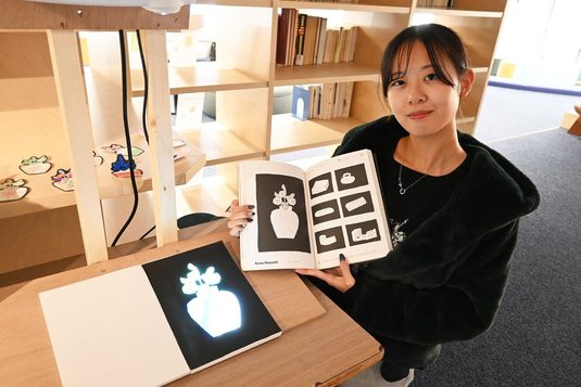 湘南キャンパス中央図書館では12月11日から1月30日まで、教養学部芸術学科の瀧健太郎准教授の研究室による「ブック・プロジェクション」の展示を行っています。2025年4月に中央図書館がリニューアルしたことをきっかけに、瀧准教授の研究室では日ごろ取り組んでいるプロジェクション・マッピングとのコラボレーション企画を立案しました。7月に図書館の職員向けにプレゼンテーションを行い、夏期休暇明けの9月に選定された2冊の書籍を紹介することが決定。プロジェクターの設置台も学生たちが木材で手作りし、図書館が開館している午前9時から午後7時までの間、1階Islandsコーラルで展示されています。