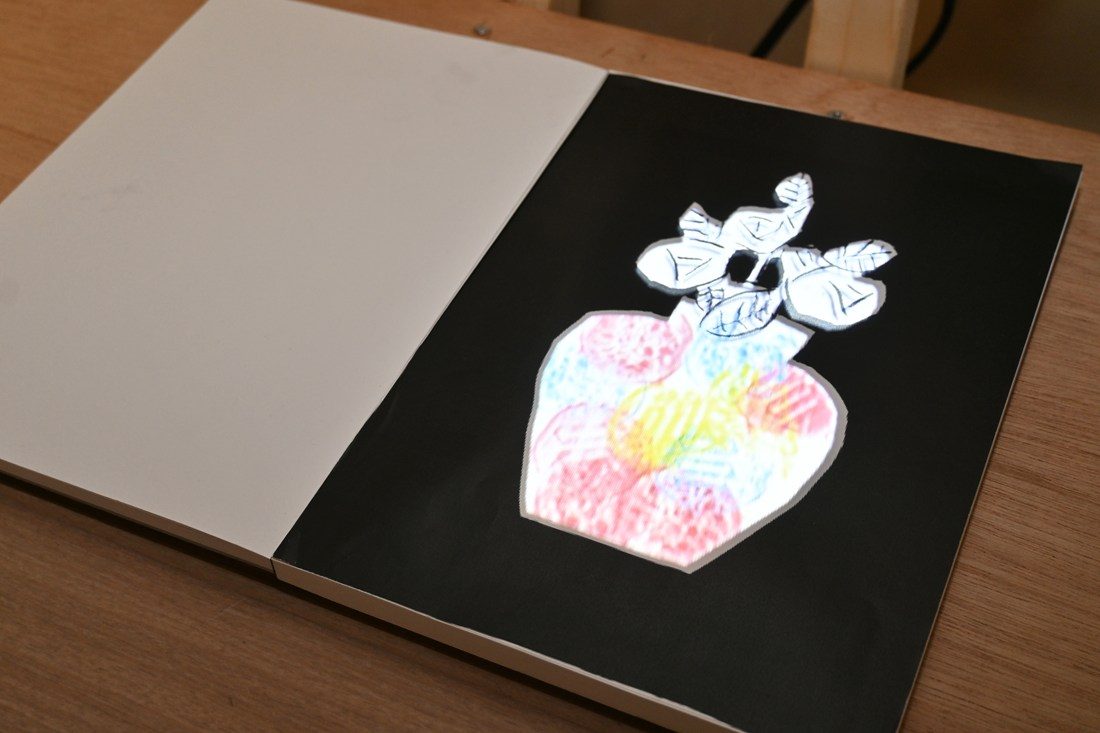 さまざまなアーティストがモノクロで描いた作品の画集『モノクロ絵の世界』(BNN編集部編/ビー・エヌ・エヌ新社)をテーマにしたグループは、書籍と共に、作品集から選んだイラストの刷り出しとクレヨン、箱を設置。図書館の利用者がクレヨンで自由に色を塗り、備え付けの箱に入れたものをデータ化してモノクロ絵の上に投影するプロジェクション・マッピングを制作しました。小泉菜々子さん(3年次生)は、「図書館を利用する人々と私たち芸術学科の学生が、作品を通じて楽しみを共有できる展示にしたいと考えました。1~2週間に一度箱の中身を回収しているのですが、展示開始から年末年始の休暇明けまでに30点以上集まり、想像以上の反響に驚いています。大人になると塗り絵をする機会はなかなかないと思うので、童心に帰って楽しみながら参加し、図書館を利用するきっかけにもしてもらいたい」と話しています。
