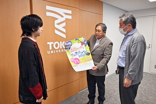 10月11日には、同町の戸村裕司町長らが湘南キャンパスを訪問。刷り上がったポスターが渡邉さんに手渡されました。戸村町長は、「現代的な色合いとフォントがとても印象的でした。我々ではなかなか発想できないようなデザインで、教えをいただくようで大変ありがたいです」と話していました。