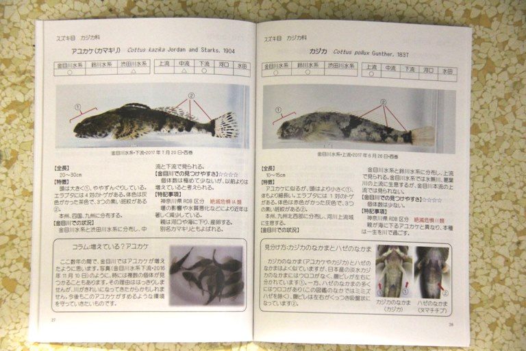 西巻さんは約1年間、何度も金目川に通い、魚を採集して水系ごとの分布(金目川水系、鈴川水系、渋田川水系のどこに生息しているか)と、生息環境(上流、中流、下流、河口のどこで確認できたか)を調査。図鑑で使用する写真も撮影し、文献を読み込んで特徴などをまとめました。西巻さんは、「1種類ずつ写真を撮り、文章を考えるのはとても難しかったのですが、北野先生や柳川さんに相談しながら一つずつ進め、過去に研究室の先輩方が撮影した写真や資料も使わせていただきました。金目川での見つけやすさを星印の数で示したり、コイとフナの見分け方や採集のルールといったコラムを掲載したり、写真を多く入れて子どもたちにも興味を持ってもらえるように工夫しました。観察会などで活用してもらい、多くの人に金目川の魅力を知ってもらいたい」とコメント。北野教授は、「これまで研究室で取り組んできた成果が一冊にまとまったように感じています。金目川にはアユカケのように、きれいな川にしか生息しない珍しい魚も多くいます。この図鑑が地元の自然や文化に関心を持ってもらうきっかけになればうれしい」と話しています。