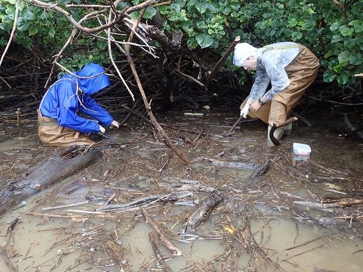 北野教授は、西表島にある本学沖縄地域研究センターと共同で、2007年から島内の水生生物の生息状況や生態調査および保全活動に取り組んできました。2013年9月の調査中に、これまで見たことのない水生昆虫を採集したため、詳細に調べたところ、国内での記録がない「Spercheus stangli」と確認。本科の構成種の多くは、オスの頭の両端が突出していることから鬼の角に見立てて「オニガムシ科」「オニガムシ属」と名付けるとともに、本種は背中にコブのようなふくらみがあることから「コブオニガムシ」と命名しました。北野教授は、「西表島には水生昆虫の研究者が多く訪れますが、コブオニガムシは動きが非常に緩慢なうえ、枯れた木の裏側に張りついているので、これまで見つからなかったのではないかと思います。多様な生物が生息している西表島に本学の研究施設があることは、研究調査の躍進に大きくかかわり、学生の教育の幅も広がります。今後もセンターにお世話になりながら、学生とともに調査を継続することで、教育の場として活用していければと思います。また、西表島をはじめとする南西諸島の生物相や各種の生態を明らかにし、それらの知見を保全に役立てたい」と話しています。