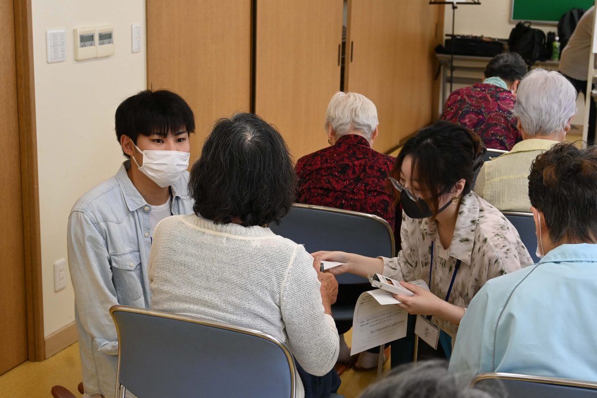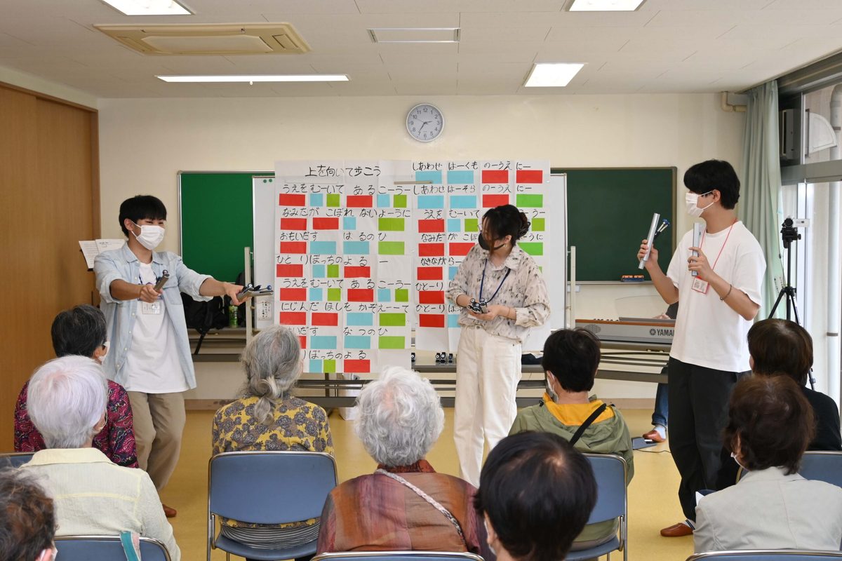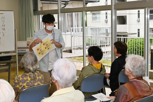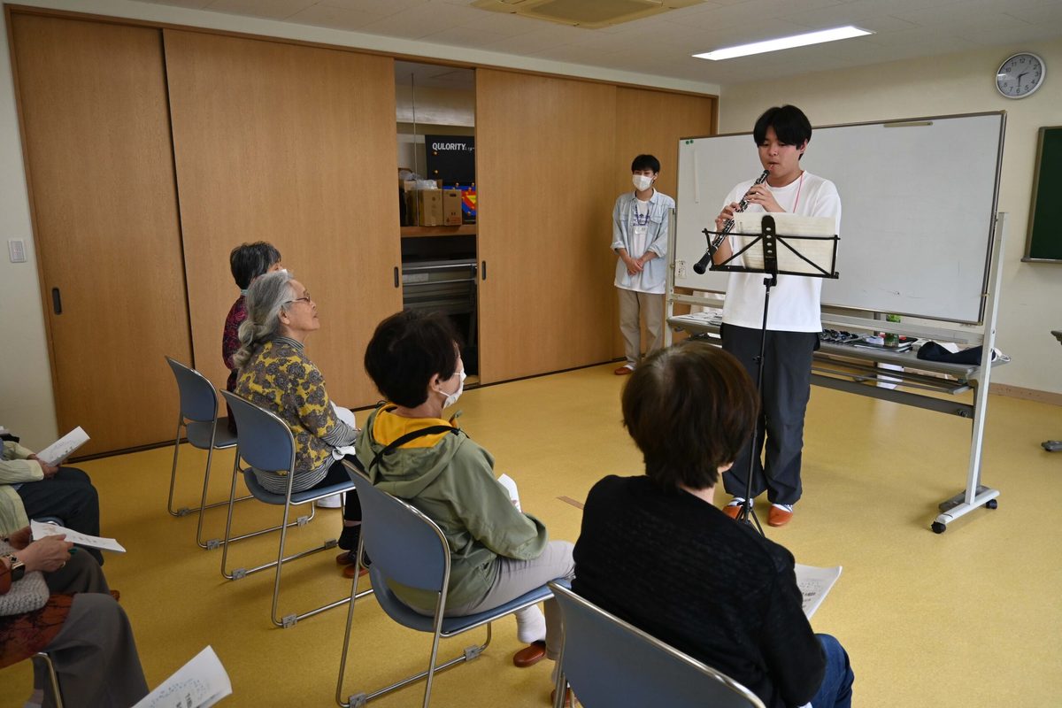 5月20日の回では、「花」をテーマに選曲した1時間のプログラムに団地在住の高齢者19名が参加しました。1曲目の『バラが咲いた』を歌う前に、誤嚥を防止するために口と舌の動きを訓練する「パタカラ体操」を紹介。学生が「『バ』『ラ』『タ』など舌を大きく動かす箇所を意識し、口を大きく動かして歌ってみましょう」と呼びかけながら合唱しました。続いて『この広い野原いっぱい』を歌う際、「団地の階段を上るときに息切れしないよう、肺活量を鍛えましょう」と、学生の合図で息を大きく吸い、一息を長く歌いあげました。合唱のほかにも、学生によるオーボエの演奏披露や、片手で振るだけで美しい音が柔らかに響く「トーンチャイム」という楽器を配り、『上を向いて歩こう』の合奏唱で大いに盛り上がりました。また、曲の合間には学生が自身の好きな花を紹介し、花言葉や季節の話題で参加者とコミュニケーションを取る場面も。最後は手拍子に乗せて『一人の手』を合唱して締めくくりました。