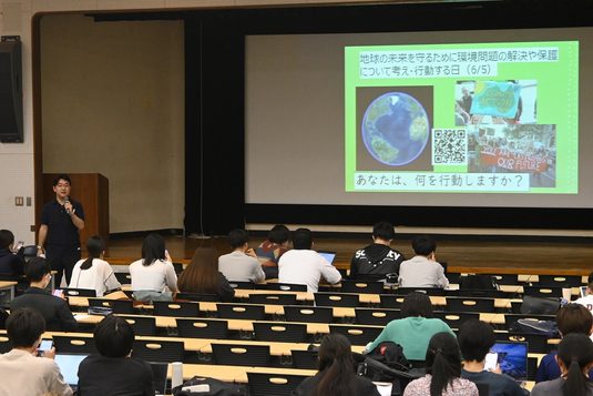 教養学部人間環境学科の開講科目「教育概論」(担当教員=岩本泰教授)で6月5日に、国連が制定する「世界環境デー」に合わせた特別講義を実施しました。「世界環境デー」は、1973年に国連総会で制定されて以来、環境に関する最大の国際デーとして国連環境計画(UNEP)が主導しています。今年は公式ホームページ上で世界各国に向けて世界環境デーに関連したイベントの開催が呼びかけられ、3000以上の団体が参加。環境教育やESD(持続可能な開発のための教育)に関する内容の本授業も参加登録し、世界の環境問題をテーマとした特別講義を実施しました。