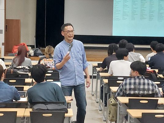 教養学部人間環境学科の開講科目「エシカル消費論」(担当教員=岩本泰教授)で5月16日と23日に、環境・社会問題の解決に向けてサステナブル素材のコンサルティングや普及に取り組む一般社団法人M.S.I.の稲垣貢哉氏を学外講師に招いて繊維産業に関する特別講義を実施しました。この授業は、持続可能な社会づくりに向けて具体的な消費行動を構想する能力を養うことが目的で、主に製品が原材料の調達から製造・流通・販売・消費・廃棄されるまでの過程を指す「製品ライフサイクル」についても学んでいます。