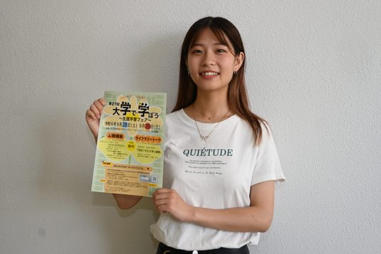 教養学部芸術学科3年次生の鈴木陽さんが、かながわ大学生涯学習推進協議会の「第27回大学で学ぼう~生涯学習フェア~」の告知チラシをデザインしました。同協議会は神奈川県内の大学と県立図書館で構成されており、大学で学ぶきっかけづくりを応援するためのイベントとして9月28日、29日に公開講座とライブラリートークが開かれます。今回は同協議会からチラシ制作の依頼を受け、本学科の3年次生14名がデザイン案を提出した中から鈴木さんの案が選出されました。チラシは1万部刷られ、県内各地の役所や公民館などの公共施設に設置される予定です。