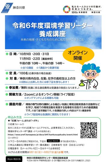 〒254-0014 平塚市四之宮1-3-39 電話 0463-24-3311(内線251、252) 令和6年度環境学習令和6年度環境学習リーダー養成講座 – 神奈川県ホームページ (pref.kanagawa.jp)