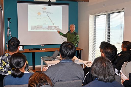 今回は、来年5月と11月に計画している「猫の島サミット」(仮称)に向けた準備会議として、初めにコワーキングスペース「sea glass」で中間報告会を行い、ねこだんごのメンバーや木之内均熊本キャンパス長、地域住民や関係者ら約30名が参加しました。前田教授が活動を始めた経緯や、動物看護師らの協力を得て行った身体測定の様子、観光客への聞き取り調査の結果を報告するとともに、村上教授とゼミ生たちが制作したオリジナルサイトも紹介。「地域おこし協力隊の林愛子さんを中心に、湯島の猫たちは出生日や名前、ワクチン接種の有無などがきちんと管理されており、他の“猫の島”のモデルになり得ると考えています。サミットでは全国の猫の島から保護団体の代表者や地域ねこを世話している大学サークルなども招いて、離島振興や動物観光について話し合い、交流を図りたい」と話しました。その後は参加者も交え、湯島の現状や新たな観光資源などについて意見交換しました。