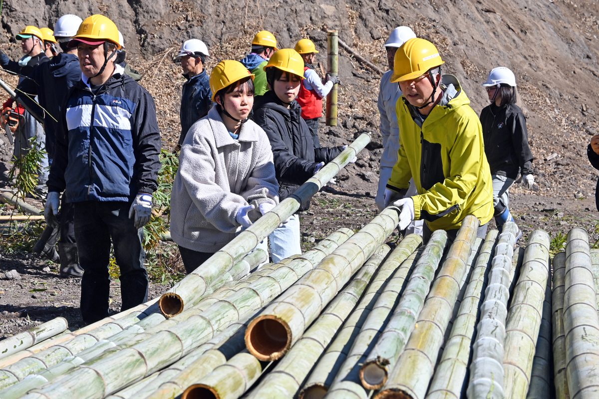 初日は、同市で毎年11月に行われている2万本の竹灯籠を灯すイベント「竹楽」に向けた竹の伐り出し作業を手伝いました。同市には540haの竹林が広がっていることから、竹害を防ぎ、保全のための伐採作業を継続しようと始まったイベントで、今年で25回目を迎えます。竹田市にある祖母山の主神「豊玉姫」が長野県安曇野市の穗髙神社の祭神「穂高見命」と姉弟という神話に基づき、竹楽で使用した灯籠は穗髙神社に運ばれ、12月に「神竹灯」も行われています。竹の伐り出しには地域住民のほか、安曇野市観光協会の職員らも参加。学生たちは山から伐り出された竹を運び、共に汗を流しました。