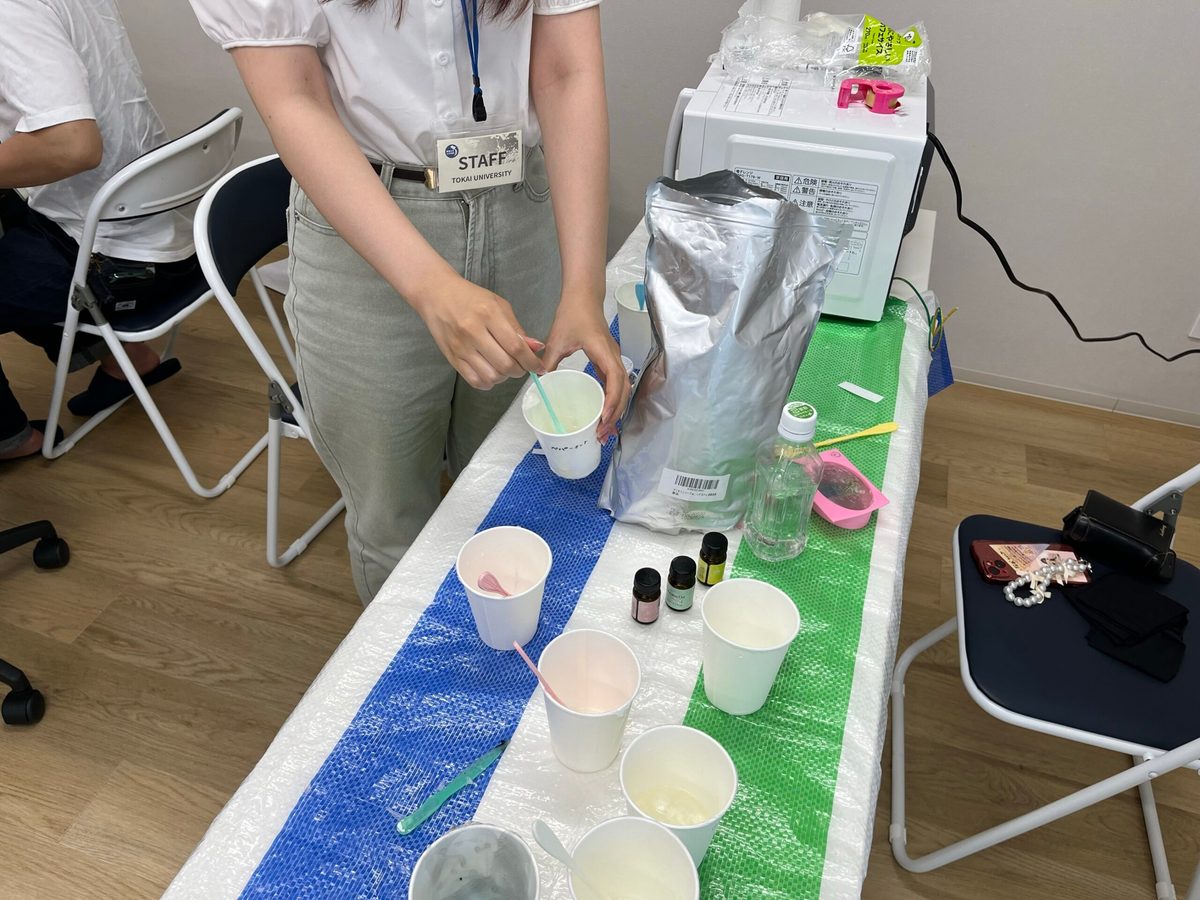 人文学部人文学科の学生たちが考案した静岡県焼津市の焼津温泉の源泉を使ったせっけんのワークショップを、5月26日に同市の元湯なかむら館で開かれたイベント「なかむら館DE Marche」で開催しました。温泉や海洋療法による地域振興などが専門の斉藤雅樹教授が、同館の植田正樹社長から焼津温泉の認知度向上を図るための温泉を使った製品開発について相談を受けたことがきっかけとなり活動を開始。その中で、家庭で手軽に使えるせっけんの開発に向けて、「温泉せっけんプロジェクト」と題し、2022年9月から月1~2回のペースで学生たちが同館に集まり検討を重ねてきました。