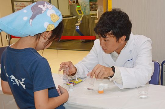 学生たちはこれまで、材料や製法をはじめ、商品コンセプト、ターゲットなどを議論し、カラフルな見た目で、泡立ちの良い製品となるよう活動を続けてきました。斉藤教授は、「せっけんの製作工程では通常、塩を入れて製品を長持ちさせますが、焼津温泉は元々塩分を多く含んでおり製品が安定しやすいことが特徴。ご家庭でも気軽に温泉の効能を楽しんでもらえるのでは」と話します。「オリジナル温泉石けん作り」と題して来場者に製作体験をしてもらうワークショップでメンバーたちは、来場した子どもたちにも分かりやすく作り方を教え、用意した型枠に小さく色づけしたせっけんを置き、その上に溶かしたせっけん液を流し込む作業をサポートしました。渡部碧さん(3年次生)は、「今回の企画は地元に根付いたものとなっており、人文学部で地域マネジメントを学びたかった自分にとってとても良い経験となりました。プロジェクトとしては、今回体験として企画したせっけんを実際に商品化できるように進めていきたい」と話します。