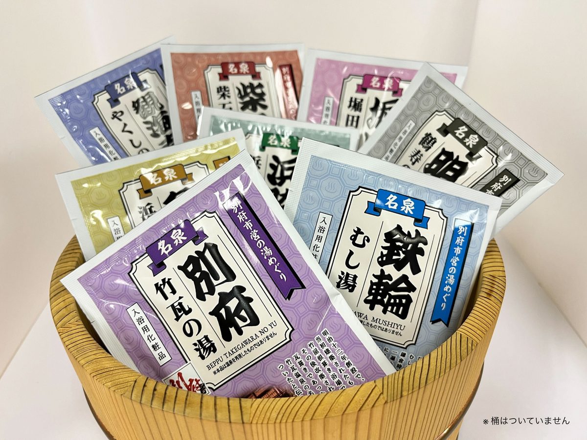 開発した入浴剤は、市内に点在する8つの代表的温泉地「別府八湯」の泉質や香り、色を再現したもので、自宅の浴槽で本物の温泉がイメージできるように工夫されています。10月から「別府市のふるさと納税サイト」で受付が開始されているほか、市内のおみやげ品販売店や市営公共施設でも、1袋220円(税込み)で販売されています。