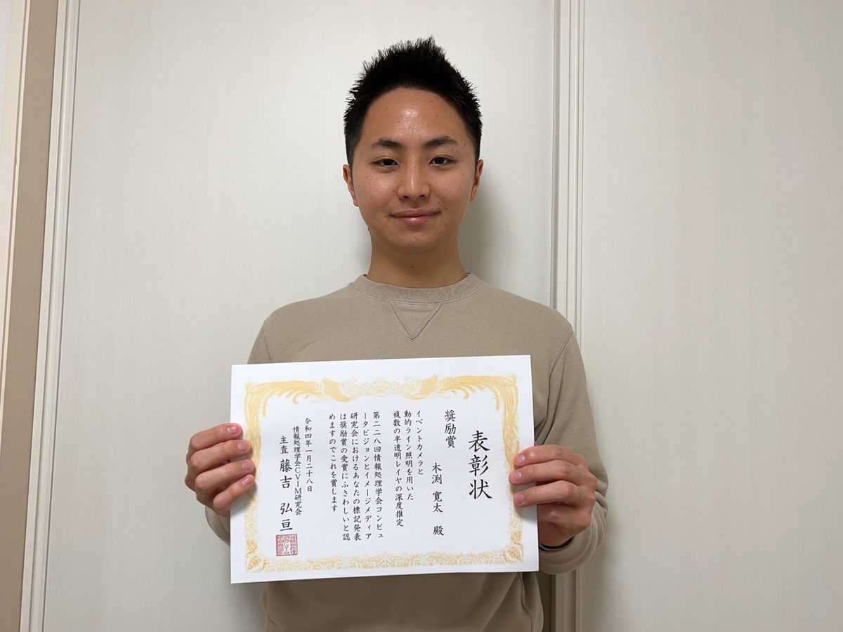 情報通信学部情報メディア学科4年次生の木渕寛太さんが、1月28日にオンラインで開催された「第288回 情報処理学会コンピュータビジョンとイメージメディア研究会」で奨励賞を受賞しました。この研究会は、コンピュータビジョン(CV)や画像生成ならびに関連分野の研究者に発表と交流の場を定期的に提供することによって、研究レベルの向上と技術の普及することを目的としたものです。