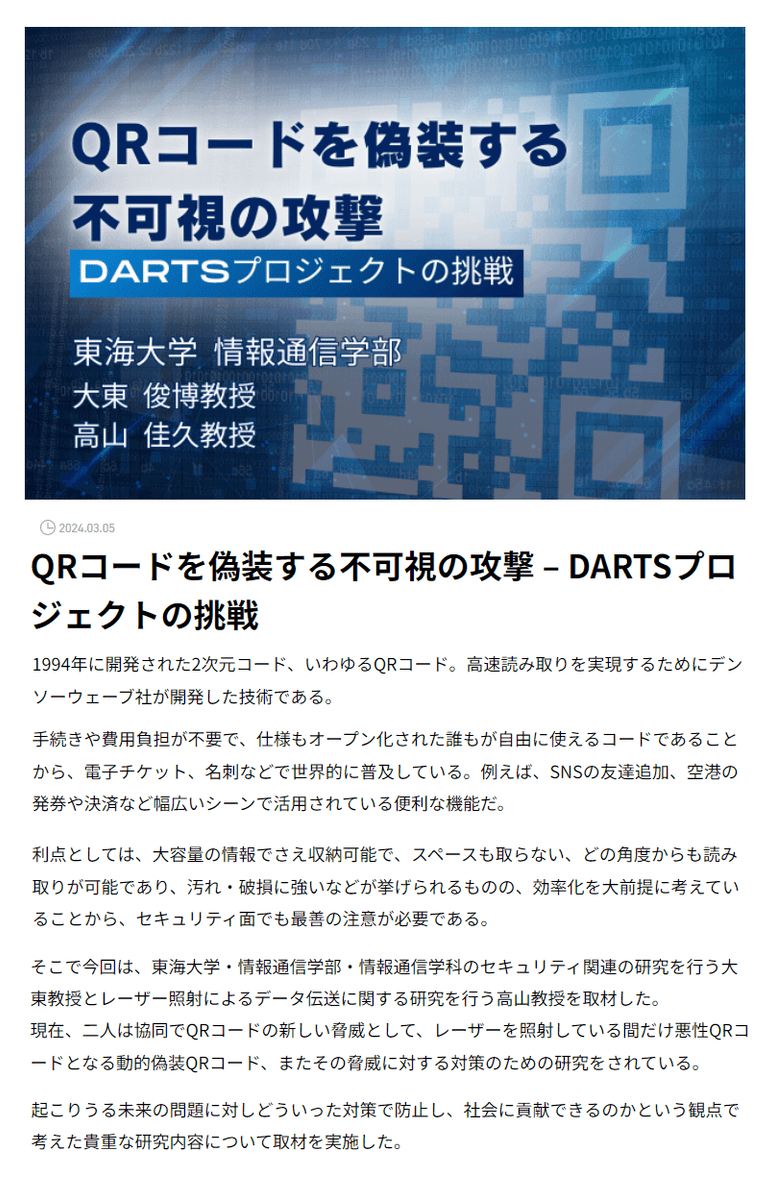 情報通信学部情報通信学科の大東俊博教授、高山佳久教授が株式会社EXIDEAのWebマガジン『So-gúd(ソウグウ)』から取材を受け、インタビュー記事が公開されました。「QRコードを偽装する不可視の攻撃 – DARTSプロジェクトの挑戦–」と題し、セキュリティの研究者とレーザーの研究者がコラボした共同研究(レーザーを照射している間だけ悪性のQRコードとなる新しい脅威とその対策)について紹介されています。ぜひご覧ください。