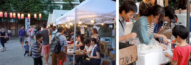また同日には、高輪地区のイベント開催などで関係の深い商店街「メリーロード高輪」からの依頼を受け、高野山東京別院で行われた「高輪盆踊り」(主催=高 輪親睦会)にも参加。輪投げや的当てなどができる「遊戯コーナー」を手伝いました。さらに30、31の両日には、泉岳寺前児童遊園で開催された「夏祭り大 盆踊り大会」(主催=高輪泉岳寺前商店会)で、商品の引換券の配布や出店の販売の手伝い、地域の催しを盛り上げました。