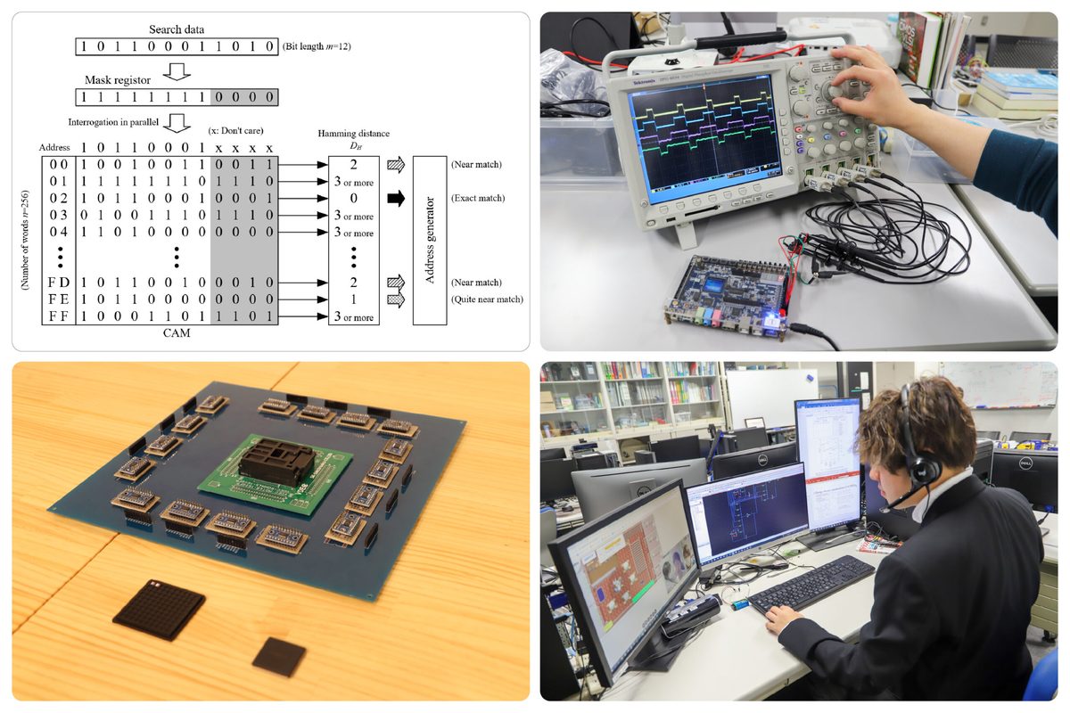 連想メモリは、通常のメモリに専用回路を付加することで並列照合を可能にし、外部から入力した検索データと同一あるいは類似した記憶データを高速かつ効率的に出力できます。当研究室では連想メモリに「ニューロンMOS」という新デバイスを活用した、より高度な情報検索システムの構築を目指し、実際の集積回路の解析・設計・評価を行っています。また、東海大学熊本キャンパスの藤本研究室との共同研究を実施しています。