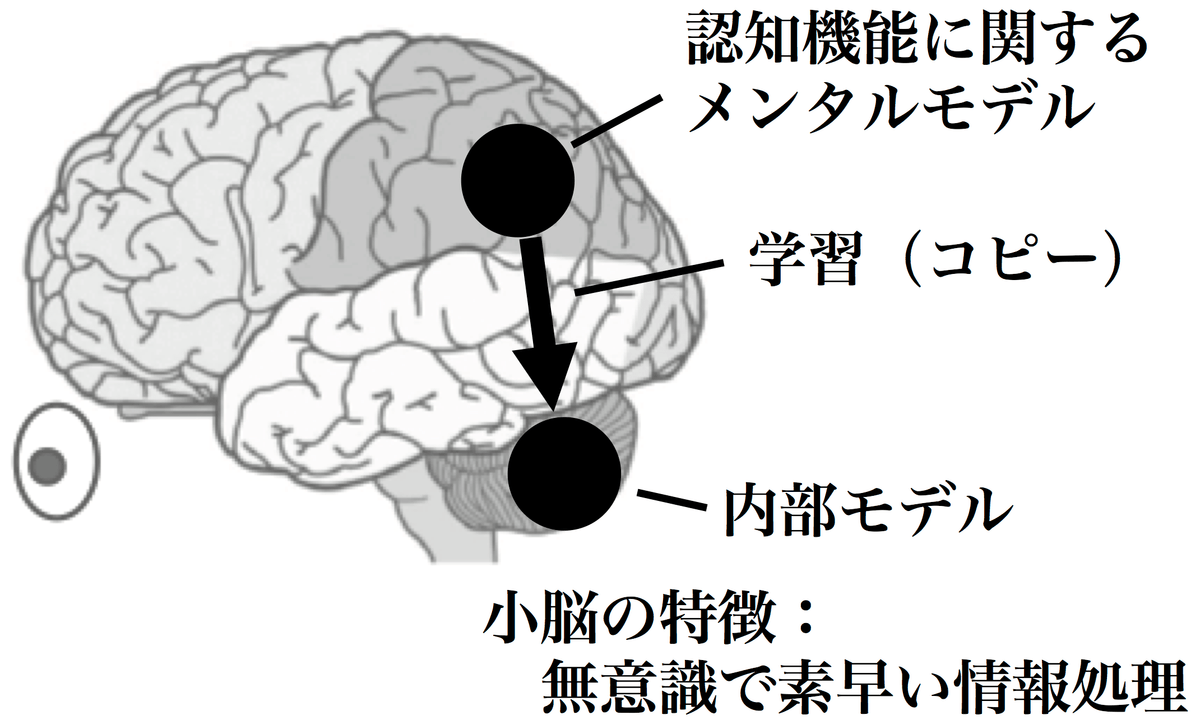 運動の熟練と同様のメカニズムが認知機能の熟練にも当てはまるのではないかと考えています。例えば将棋の場合、将棋の指し手を考えるための知識や経験がメンタルモデルとして大脳皮質内に形成され、熟練とともに小脳に内部モデルが獲得されます。