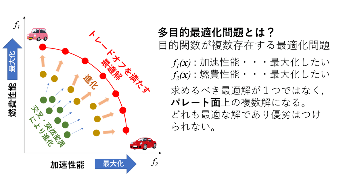 ロボットを環境の変化に対応して適切に行動させるには、置かれた環境やロボット自身の個体差に着目したロボット制御を行うことが理想です。本研究では、進化計算(Evolutionary Computation)を応用したロボット制御に取り組んでいます。進化計算は、元々は生物の進化にインスパイアされて誕生した研究領域であり、複数の目的が存在する最適化問題(多目的最適化問題)などにも応用されます。
