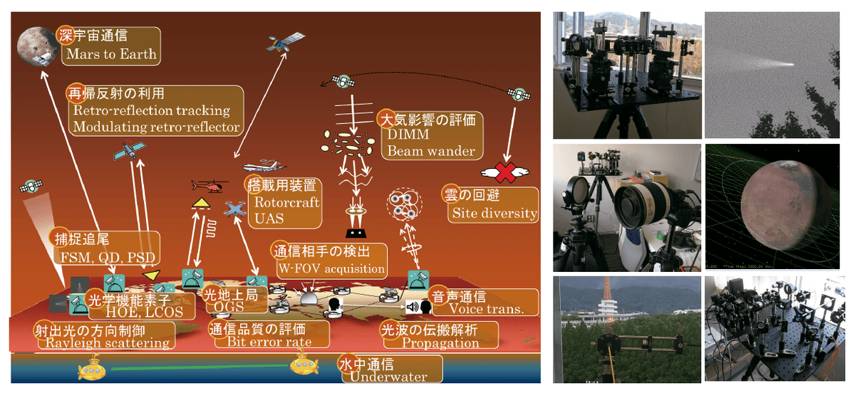 重要な社会基盤の一つである情報通信ネットワーク技術は、有線による通信技術と無線による通信技術で構成されています。光の空間伝搬を利用する通信は無線技術に含まれ、電波での通信と比べて小型の装置で、大容量データ伝送を提供できる技術として、移動体を用いた通信や、宇宙と地上との通信への適用が期待されています。