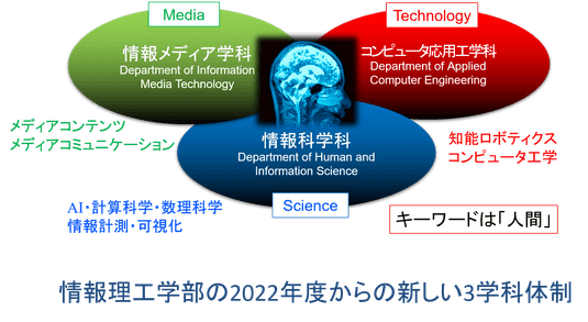 このような社会の中で忘れてはならないのは、情報とは、人間やそれに変わる機械などの「受け手」との関係を含めて捉えられるべきものである、ということです。当学部は「人間」をキーワードとして、人間・情報・機械を総合的に捉えた研究・教育を行っています。情報を総合的に捉えて、それを社会で活かしてゆくためには、豊かな人間性、強靭な基礎学力、実践的な応用力が重要です。本学部では研究の第一線で活躍する教員陣が、人工知能・計算科学から、ロボティクス、メディア、医療・地球環境などの情報計測に至るさまざまな分野で、新たな知見や経験を皆さんに提供します。