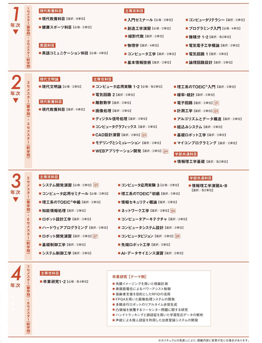 実験・実習科目を多数設けており、教室で学んだ理論を実験室で体験することで、基礎から段階的に技術力を身につけられます。コンピュータシステムやロボットは、日本の産業を支える基幹技術であるだけでなく、ハードウェアとソフトウェアを習得する上で、大変効果的な教材でもあります。ものづくりやロボット製作を通して、実装する喜びとともに高度な実装力を習得します。