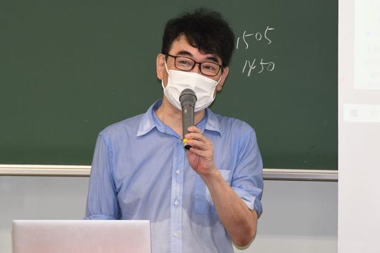 情報理工学部情報メディア学科では7月21日に湘南校舎で、「情報メディア概論A」の最終講義を実施。本学科の今西隆志客員教授が講演しました。この授業は、本学科の1年次生を対象に、教員が交代で専門分野に関する講義を行い、学生が基礎知識を身につけるとともに研究テーマを見つけるきっかけにすることを目的としています。今西客員教授は「アニメーションのデジタル化と3DCGアニメーションの台頭の歴史について」と題して、アニメーションの歴史や技術の発展などについて講演しました。