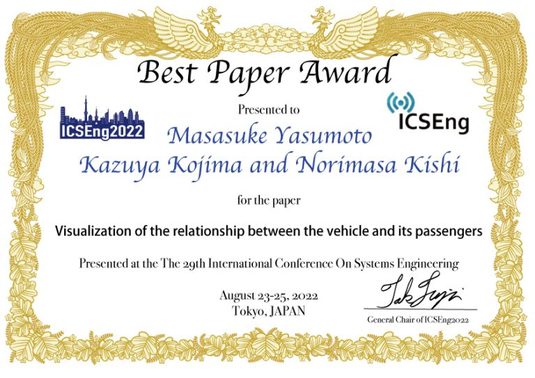 8月23日~25日に東京で行われた国際学会、第29回International Conference on Systems Engineering (ICSEng2022)(http://icseng2022.net/)にて、情報メディア学科の准教授、安本匡佑らによる研究発表「Visualization of the relationship between the vehicle and its passengers」がBest Paper Awardを受賞しました。