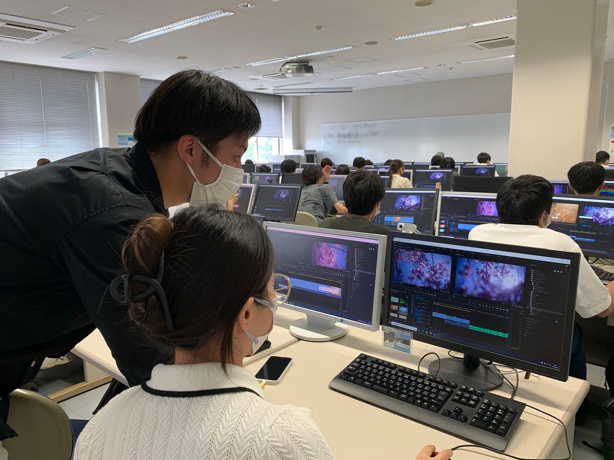 「コンピューターリテラシー」の授業では動画クリエーターの伊藤弘先生にお越しいただき、映像制作と動画編集のノウハウについて授業を行っていただきました。授業のテーマは伊勢原市出身のミュージシャンのプロモーションビデオを制作するというもので、学生一人一人がアドビ社のプレミアを使用し、映像コンテンツの制作に取組んでいます。完成した作品はミュージシャンの元に届けられる予定です。