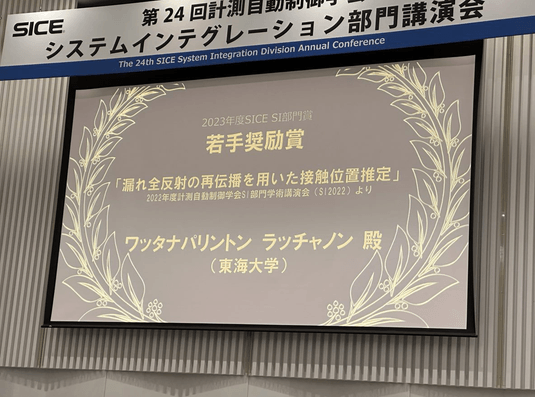 2023年12月14〜16日に新潟・朱鷺メッセにて開催された第24回計測自動制御学会システムインテグレーション部門講演会(SI2023) にて、ワッタナパリントン ラッチャノンさんが2023年度の部門若手奨励賞を受賞ました。部門若手奨励賞は、システムインテグレーション部門が主催・共催した昨年度の講演会にて、評価の高い研究発表を行った35歳以下の個人、5名に贈られる賞になります。