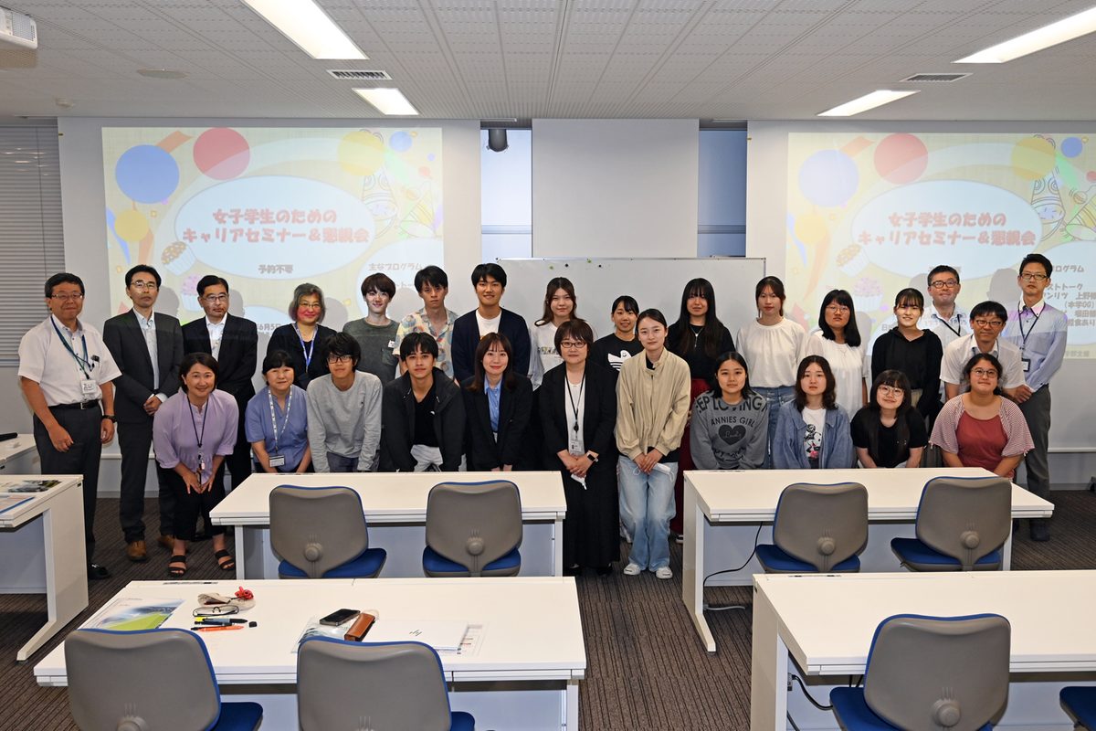情報理工学部では6月5日に湘南キャンパスで、「女子学生のためのキャリアセミナー&懇親会」を開催しました。本学部における女子学生の入学者数は増加傾向にありますが、男子学生に比べると2割未満と少ないことから、女子学生がキャリアについて考え、情報交換できる機会を増やそうと企画したものです。当日は、女子学生だけでなく男子学生、教職員らも含め約30名が参加しました。
