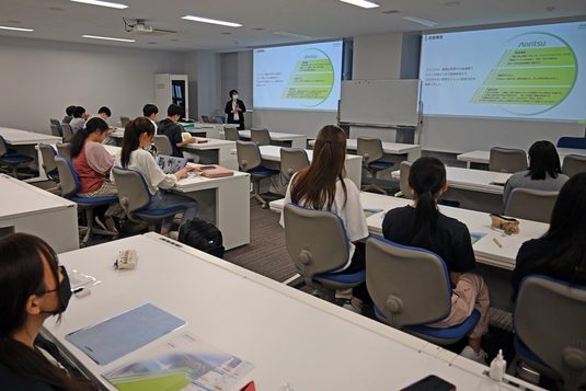 初めに前田秀一学部長があいさつに立ち、「女性の先輩たちが頑張ってきたことで、昔に比べて職場環境はずいぶん変わってきました。今日は男子学生も多く参加していますので、近い将来、『女子学生のための』と銘打たなくてもよい時代になっていくのではないでしょうか」と語りました。続いて株式会社マイナビのキャリアサポーターが講演し、「内定イコールゴールではありません。どのような人生を送りたいか、どのようなキャリアを築きたいかを考え、なりたい自分に近づけるように努力する、仕事や社会の仕組みなどを知ることが大切です」と話しました。さらに、男性・女性別の雇用形態別平均賃金や生活に必要なためのコスト、総合職と一般職の違いなどを解説し、企業の探し方として「女性の採用人数や職種別の採用実績、女性の役職者、産休・育休の取得数などに注目しながら調べてみてください」とアドバイスを送りました。続いて本学卒業生でアンリツ株式会社に勤務する上野真樹さん(大学院工学研究科2007年度修了)が講演し、同社の業務や自身の入社後のキャリアを説明。就職活動の経験を振り返り、「合同説明会で会った人事の方と会社の雰囲気、姿勢にひかれて今の会社を志望しました。やりたいことはもちろん大切ですが、会社や先輩の雰囲気も見ながら、そこでキャリアを進めていけるかを判断するといいのではないでしょうか」と語りました。